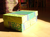 Die Kiste jedes Kindes bekommt einen Platz bei den anderen im Regal. Mein Therapieraum liegt unterm Dach in einem gewöhnlichen Haus. Das Haus steht in einer kleinen Stadt, die Stadt befindet sich auf der Erde, die Erde zieht ihre Kreise im Weltall, und ob selbst die auseinanderstrebenden und zusammenstürzenden Bewegungen des Alls noch „umfangen“ sind - auf diese Frage finden bereits Kinder sehr verschiedene Antworten. Die hier gezeigte Kiste ist insofern ungewöhnlich, als ich sie für eine Jugendliche bereit stellte, die sie nie gesehen hat. Denn sie wollte eine eigene Kiste mitbringen, was sie nie tat. Diese Kiste blieb also im Eckschrank meiner kleinen Küche, wo sie – eigentlich sinnloserweise - immer noch steht. Denn das junge Mädchen, es hat übrigens die Behandlung abgebrochen, ist inzwischen eine junge Frau, die – sofern sie es wollte – die Arbeit woanders fortsetzen müsste. Während der Behandlung schrieb ich einmal nach der Stunde Folgendes auf – ich glaube, es spiegelt wieder, dass das, was das Mädchen erfahren hatte, so schlimm war, dass es keinen richtigen Platz in ihrem Kopf finden konnte.